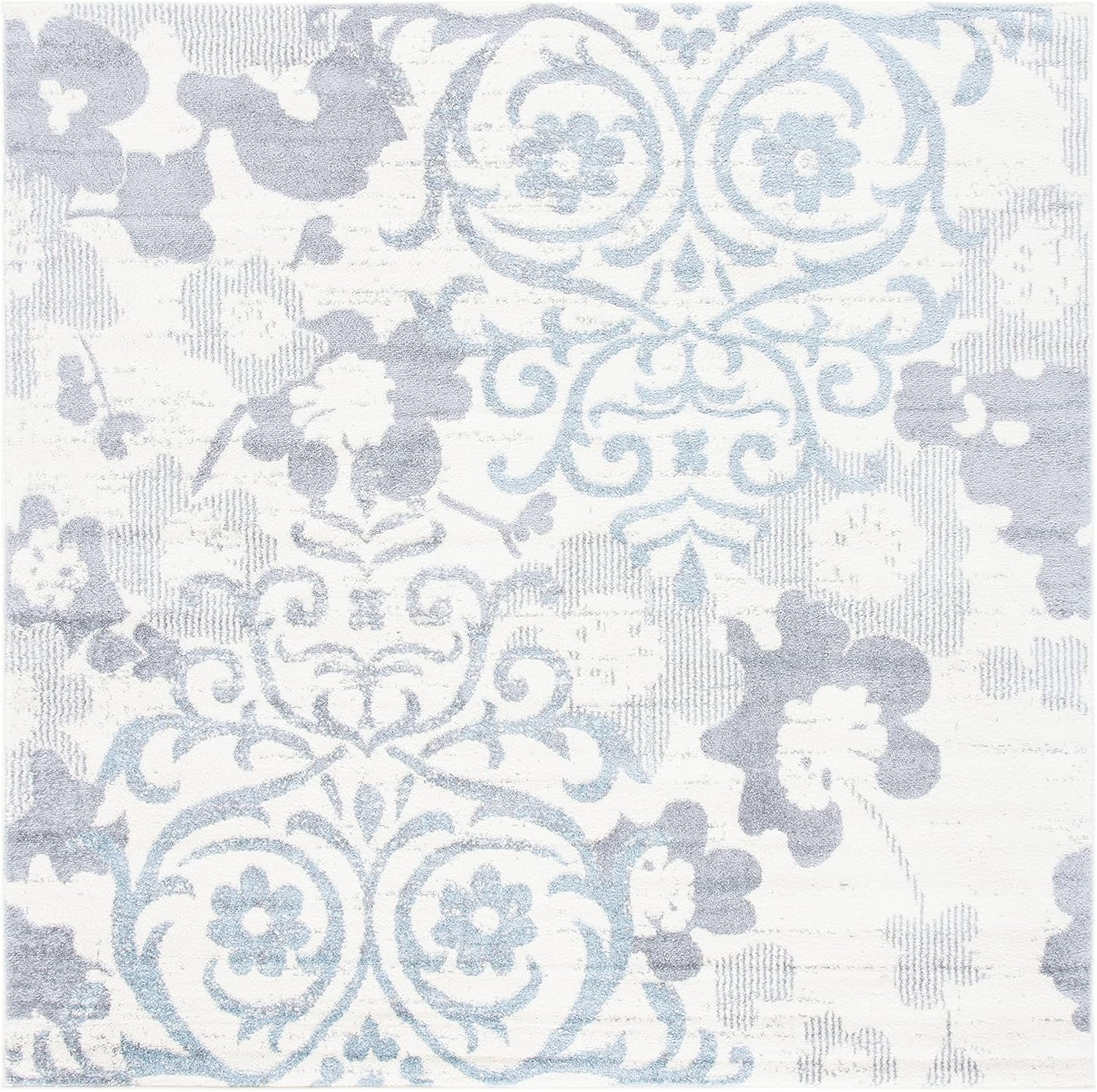 Featuring a dazzling design, this Safavieh Adirondack rug is inspired by global travel and the bold, colorful motifs adorning fashionable ski chalets. A soft floral theme in the backdrop gives this rug a delicate touch, while a dramatic antiqued ivory and silver design dominates the foreground. Its subtle washed effect gives the rug character and a playful yet sophisticated appearance. This rug has been power loomed with high-quality polypropylene fiber, which ensures that it will be long-lasting and virtually non-shedding. Its shades of grey, silver, and ivory allow for a seamless integration into any room’s color scheme. Place this rug in the bedroom, foyer, living room, bedroom, or kitchen to add warmth and stylish appeal to the area. Its low pile height allows for it to fit effortlessly beneath furniture, and its construction is designed to withstand high traffic areas of your home. Primary Material: Polypropylene Latex-free Style: Vintage Primary Color: Silver Country of Origin: Turkey Rug Dimensions: 8' Square .